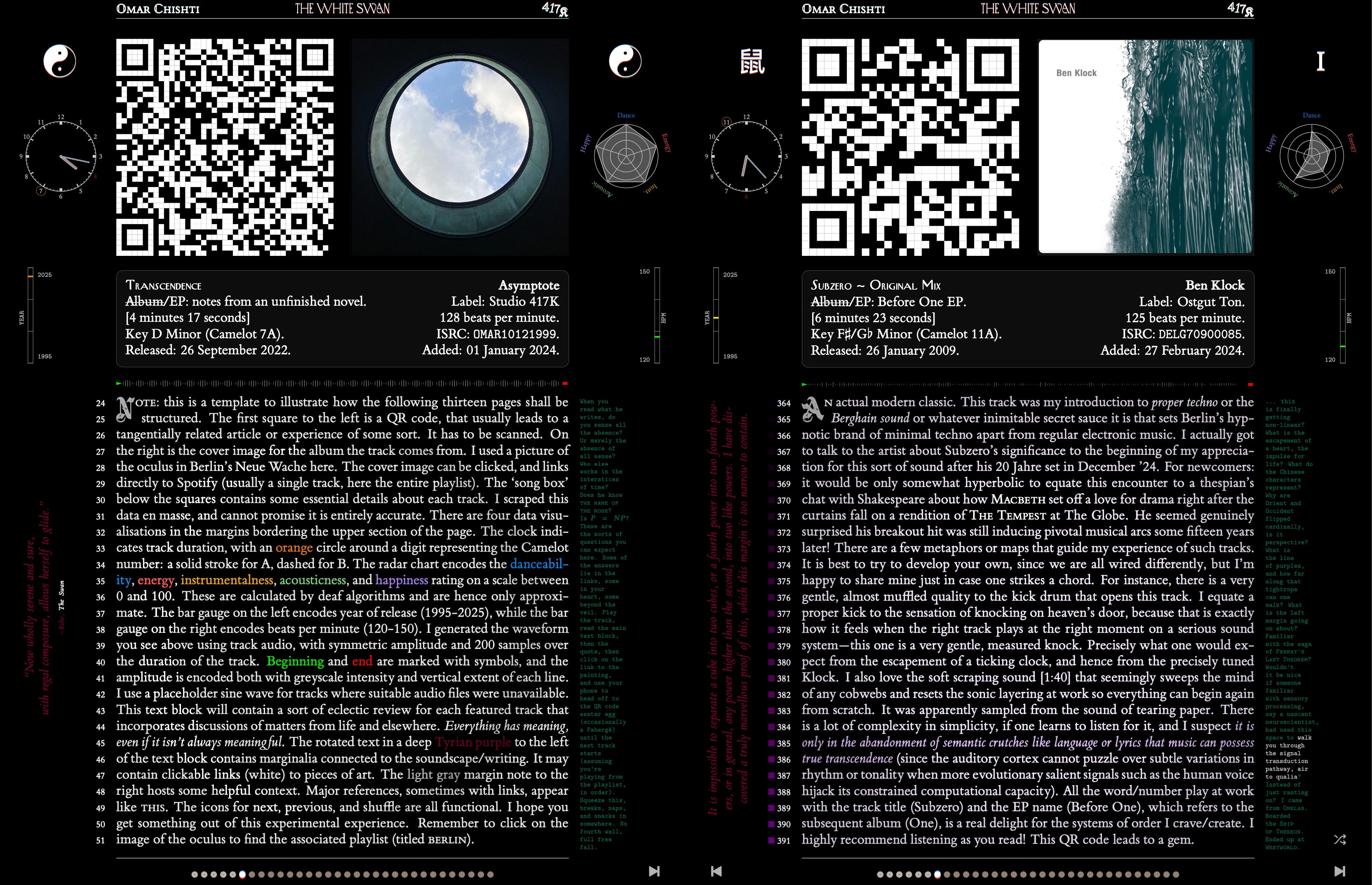 Thirteen total such pages (with plenty of embedded links and tangential QR codes to flesh out the tapestry), a visual interlude, and then a personal section that ties it all together. Can be dipped into page by page over time, with plenty of space for breaks and reflection. The rabbit holes are optional, and not all the riddles have answers. Music, writing, visualisations, quotes, questions, art—all optional, I suppose.